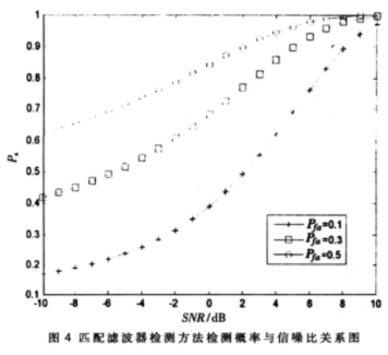 根据式(6),可以得到在高斯白噪声背景下一般匹配滤波器检测概率与信噪比的关系,如图4所示。在信噪比-10 dB~10 dB范围内,根据Neyman-Pearson(NP)准则,虚警概率分别为0.1、0.3、0.5时,对单路主用户信号进行检测,从图4可以看出,在相同的信噪比条件下,虚警概率越大,检测概率越大。当虚警概率等于0.3时,在信噪比为10 dB时检测概率达到100%。但是较大的虚警概率容易造成频谱资源的浪费,所以必须控制在一定可以接受的范围之内,减少误报的可能。