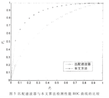 图5反映了在信噪比为-2 dB时,一般匹配滤波器和本文方法的检测性能,即ROC(Receiver Operating Characteristic)曲线。从图5可以看出,基于单循环频率循环相关匹配滤波器的检测方案,优于一般的匹配滤波器;同时,在相同虚警概率条件下,具有较高的检测概率。
