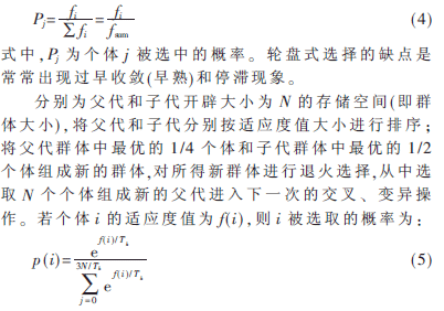 (2)退火选择操作:运用适者生存法则,繁殖操作在旧的群体中“随机”选择符号串生成一个新的种群,但选择并非完全随机,它基于一个符号串相对于整个群体的适应度。在常用的轮盘赌选择方法中,个体被选中的概率遵循Montecarlo方法,与其适应度和种群的平均适应度的比值成正比: