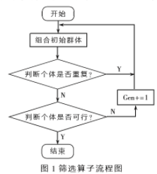 (1)初始群体的产生:为了得到理想的初始种群,首先在每个变量的取值范围内均匀产生种群,然后通过设计重组与筛选算子进行重新组合,从而保证其多样性和组合随机性。在经过交叉变异产生的子代中同样采用筛选算子使新一代种群中避免出现大量重复个体,使算法能够趋于收敛。筛选算子流程如图1所示。