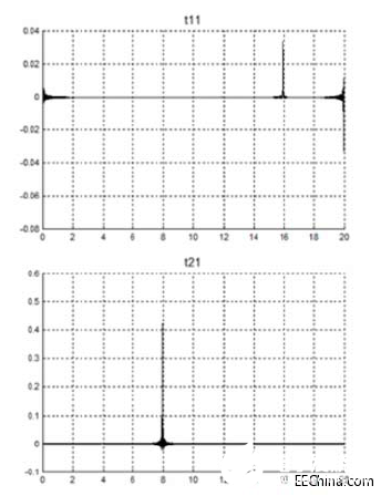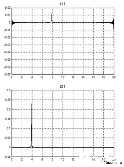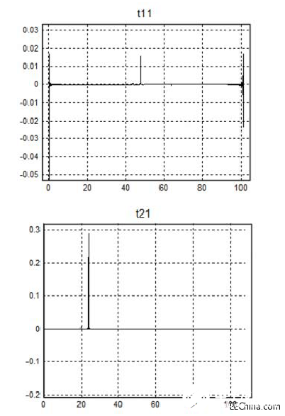 现在,我们把S参数矢量变换到时域,如下面图4所示。这要创建从内奎斯特到采样率的频谱的复共轭部分,使用从DC直到1/2采样率时内奎斯特值的S参数数据完成,然后计算IFFT。2端口S参数的时域版本将表示为t11、t12、t21和t22。