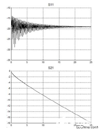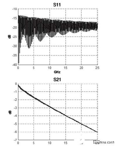 图3. 单个1.69 m电缆模型的s11和s21 S参数图。幅度(dB)对频率(GHz)。