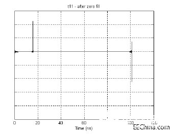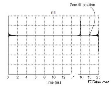 选项2:一直选择一定比例的脉冲响应,填充零。例如,从末尾在时间间隔5%的位置填充零。这种选项要求已经以足够的频率间隔测量所有原始S参数数据,以便以稳定的记录百分比为所有参数提供时间间隔,在这里将插入零填充。这也意味着在零填充点之外已经包括足够的时间,以便在这个点以后,所有反转的数据将从左到右稳定。图8和图9显示了执行零填充前和执行零填充后的结果。