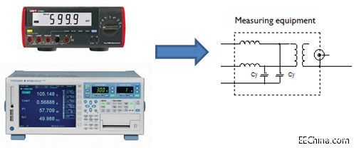 这种情况是最不安全的连接,所有设备,包括被测样品都直接连接到市电上,这样的情况下,不但人体接触到被测样品会有危险,甚至被测样品自己都会有短路危险。因此我们需要一个隔离的电源来给被测试品供电。下面两个图示的被测试样品采用了隔离电源,但仍然是不安全的。