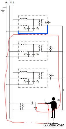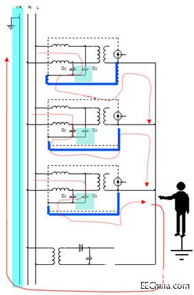 虽然被测试品采用了隔离电源,但是由于示波器的地连接到了大地,被测试品的输出电压仍能通过人体形成回路造成触电的危险。