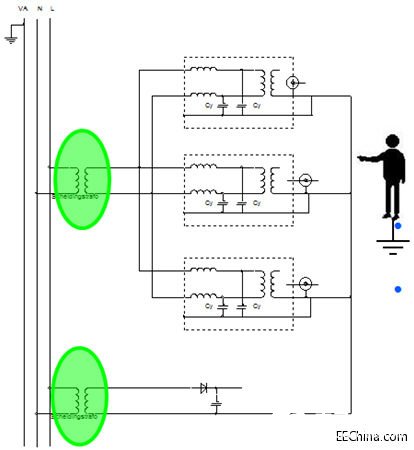 因为我们只作安全连结性的分析,因此设备模型只看输入输出,简化了其余部分。大多数的电气测量设备都是与输入电源隔离的,而我们的被测样品可能是直接整流,也可能有隔离电源,这里为了方便分析,我们统一视作从输入电源直接整流而来。另外值得注意的一点是示波器的无源探头的地是和输入线的地是连通的。
