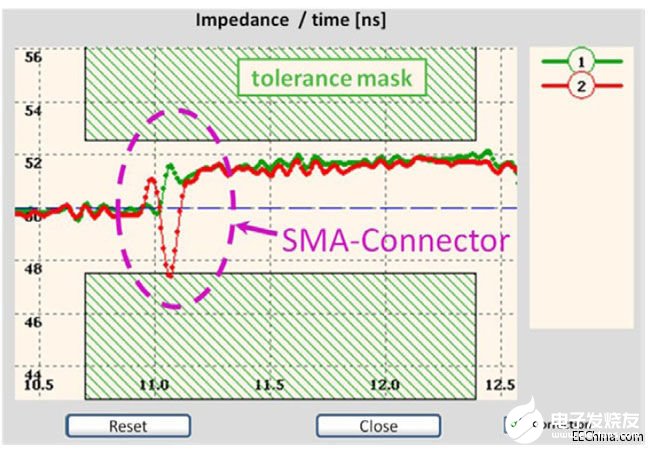 在越来越快的数字世界中,线路阻抗的测量业已表明是目前最重要的TDR应用。图2显示了对无干扰(绿色曲线)和有干扰(红色曲线)传输线的这种空间分辨式测量例子。