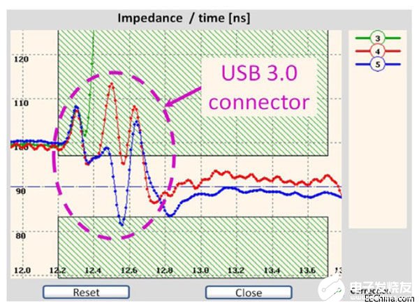 作为最后一个例子,图5显示了USB 3.0连接器和电缆的反射图。USB 3.0组件的额定阻抗是Z0=90Ω±7Ω。TDR设备仍然工作在100Ω的参考阻抗上(时间范围t《12.2ns)。从测试适配器到USB 3.0连接器的转换引起的第一次反射发生在大约12.3ns,正如预期的那样与所有测量一致。曲线3(绿色)代表开放式适配器的结果,其中的快速阻抗上升指示适配器的(高阻抗)末端。曲线4和5(红色和蓝色)代表两种不同的USB 3.0电缆组件,每个组件由一个适配器和一个后续电缆组成。虽然电缆都在规范之内,但适配器不符合规范。特别是红色曲线表明最大阻抗约为122Ω,产生了严重反射,进而可能导致USB 3.0控制器降低数据速率。
