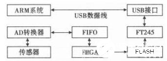 基于LabVIEW的无线测控系统硬件部分主要由传感器、AD转换器、FPGA、ARM系统、Wi—Fi无线模块、存储器FLASH、USB控制器FT245等组成,硬件总体结构图如图2所示。
