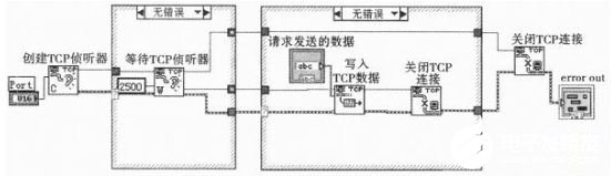 数据读取模块是软件系统的主要单元,主要的功能是向下位机发送执行采集数据的命令,并读取和回传采集到的数据。LabVIEW的优势在于已经为用户提供了封装好的TCPVI函数,使用时只需要设置服务器端TCP VI的监听端口,客户端TCP VI则只需要设置相应的要与服务器建立连接的地址和远程端口即可。在LabVIEW环境下服务器Socket通信程序框图如图3所示。