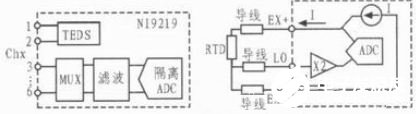 图2 NI 9219某通道的输入电路和3线RTD模式