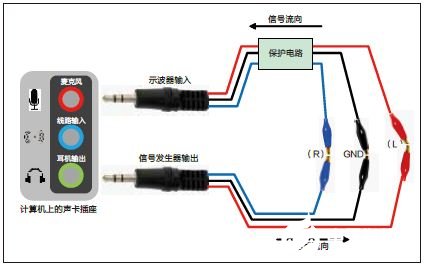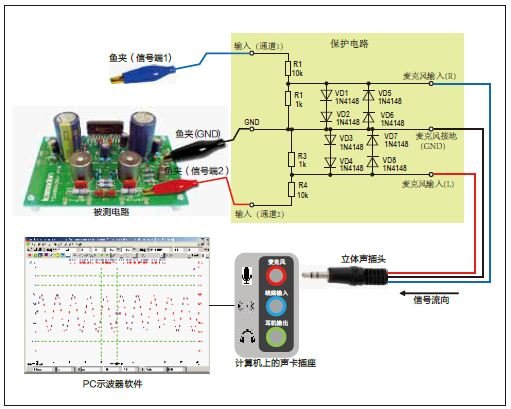 PC 信号源不涉及电路,如图3 所示,它直接把计算机声卡的输出信号引出而已。而PC 示波器与之不同,它把外界的信号输入计算机,为了保护计算机的声卡,所以添加了一个简单的保护电路,如图4 所示。被测电路某节点的信号被鱼夹引到保护电路里( 黄色底纹内),保护电路可以限制输入计算机的信号幅度不超过1.4V。