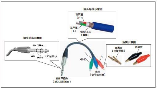 制作PC 信号源时,可以直接用一根带线的立体声插头( 图5),它有3 根导线R、L、地线,分别把绝缘皮剥去,然后用3 个鱼夹与这3 根导线连接即完成制作。