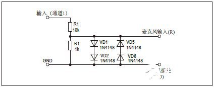 在保护电路的一个通道中还有4 个二极管,图中的型号是1N4148,查其技术手册知道其正向电压VF 约为0.7V,于是二极管VD1 和VD2 串联,可以形成1.4V 的正向电压。由二极管的伏安特性,当VD1 和VD2 上的电压超过1.4V 后,它们导通,于是在“麦克风输入(R)”端,也就是保护电路的输出端,电压为0。亦或是电压超过-1.4V 后,二极管VD5 和VD6导通,输出端同样电压为0。可见,4 个二极管保证了“麦克风输入(R)”端的电压在-1.4~1.4V范围内,从而保护了计算机的声卡。