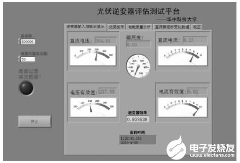 在上位机软件系统中,系统前面板的主选项卡如图10 所示。主选项卡显示输入与输出电流电压的直流值与有效值。并显示逆变器效率还有当前的系统时间。同时可以扩展显示辐照度。