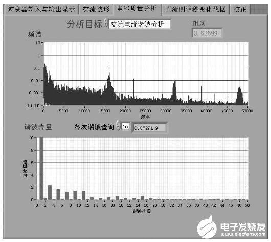 然后交流波形的选项卡显示前1s 的输出交流电压电流波形。同时包括基频、有功功率、功率因数等电能参数的显示。电能质量分析模块显示如图11 所示。分析目标可选择所采集的所有四个量,交流可以观察其谐波,而直流可以观察其纹波大小。图11 是所分析信号的整个频率,极限在奈奎斯特频率处,而下图为一些低次谐波的含量显示,同时图形显示对于真实值不够清晰,还提供了各次谐波含量精确值的查询。