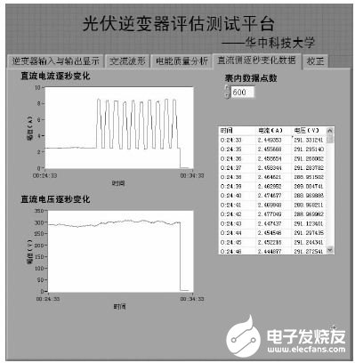 最后的是光伏直流侧的逐秒显示,主要是针对动态光照下的测试,如图12 所示。由于光照的变化是一个长时间的过程,所以我们需要针对长时间下光照变化下逆变器MPPT 的能力,实时检测实际光伏板的输出特性变化是不可能的,但可以使用光伏模拟器模拟相对严苛光照变化条件下的逆变器MPPT能力,比如图10 显示的就是10 分钟内光照在300W/m2 到1000W/m2 快速往复变化时逆变器直流侧的电压电流,可以从得到的数据中分析出光伏逆变器动态MPPT 的性能,可以认为当逆变器接实际光伏板时的性能与此时相似的。