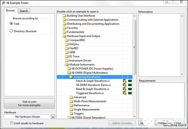 开始使用该仪器时,可运行NI-DMM范例来演示仪器的功能。 这些范例可作为应用程序开发的编程模型和构建模块。 NI范例查找器包含于部分软件应用程序中,可用于将范例归类,以便轻松地浏览和搜索所安装的范例。 用户可查看每个范例的描述及其兼容硬件型号,也可查看看特定硬件型号兼容的所有范例。