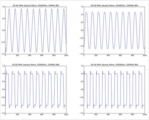 我用Python 脚本编写一个模拟滤波器,先对方波进行滤波,然后绘制出滤波结果。图2 显示了分别用一个50MHz, 100 MHz, 250 MHz,500 MHz 带宽对50 MHz方波信号滤波的结果。