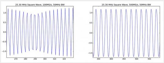 所以,你需要多高的采样率?对奈奎斯特定律熟悉的人,可能简单的认为采样率仅为待测信号带宽的2倍即可。但是当根据这个原则采集信号时,信号往往是失真的。当然,更高的带宽和采样率下,这个定律是非常适用的,例如,5倍的采样率。图3显示了用50MHz示波器采集25.3MHz的方波。此时,方波信号严重失真。然后,如果只将采样率提到到100MS/s,一下子还真无法认出是方波。与100MS/s的采样率相比,500MS/s采样率采集出来的信号更像是方波信号(但是由于示波器带宽的限制,方波还是被磨平了一些)