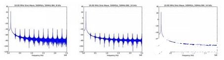 AWG也许也有一些其他的不同的特殊的功能,比如寻找跟随着采样率变化的最大的模拟带宽。请记住一个特殊的规律:一个200MS/s 的数模转换速率可以假定拥有一个100MHz的模拟带宽,但是这个信号基本是没有用的。你可以生成某个频率的正弦信号,甚至你可以生成一个更低频率的正弦波(比如10MHz),它看起来是完美的,因为DAC的滤波器对这样的高频率会有一个平滑的作用。
