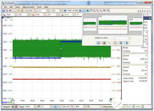 即是一些示波器声称大缓存,但是实际上,我们想要获得全部的缓存也是有困难的。PS6403D示波器是PicoTech的其中一款1GS缓存的示波器,在配套的软件上可以设置示波器的所有参数,但是该软件实际上的将驱动缓存限制在500MS左右。然而我不得不承认这真的是非常让人印象深刻的,直到存储器存满之前,一直能够保持5GS/s的采样速度,就算它建议的存储器带宽是40Gb/s!。借助于分段存储器(这个将来会介绍)我们可以用到全部的缓存,但是它不能用来捕捉一个连续的1GS大小的数据长度。