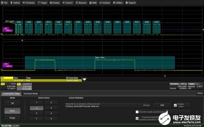 所有数字示波器都有存储和调用面板设置的功能。这个功能可以让你设置好仪器后将设置参数保存下来供日后使用,或供经验较少的用户使用。这些存储的设置可以根据需要随时调用。基本模式的CustomDSO(在有些型号中是可选项)扩展了这个功能,它能让你将多个设置文件链接成一个有序测试序列,按一下用户定义的按钮就调用一个测试。所调用的设置本身还可以包含对其它设置的调用,因此允许你创建多层次的测试。图1显示了基本模式CustomDSO应用的一个例子,它实现了SPI低速串行接口测试的设置自动化。
