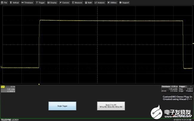 注意,在图2所示的CustomDSO描述框中CustomDSO有两种操作模式(显示在左边)。第2种模式是“插入(plug-In)”,是一种功能更强大的模式,可以让你在设置文件中增加自己的ActiveX控件。这些控件由VB、Visual C++或其它ActiveX兼容编程语言编写的例程加以定义。有了ActiveX控件后,你就可以创建你自己的定制用户界面。有大量交互式组件可用,包括按钮、复选框、单选按钮、列表框、图片框和普通对话框。图3显示了使用两个按压按钮的插入式GUI例子。第1个按钮是Single Trigger,启动单次采集。第2个按钮将通道1(C1)中的波形发送到波形存储器M1,再依次从M1传送到M2、M2到M3以及M3到M4,高效地将以前存储的波形移过已有的波形存储器。这后一种功能如果是人工完成的话几乎需要按12次按钮。