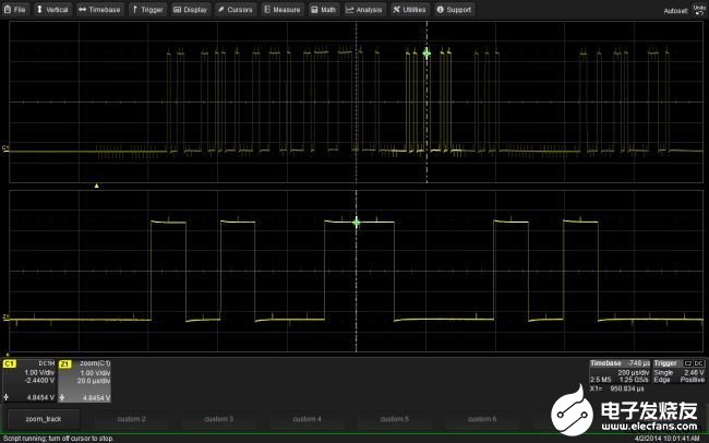 图4:使用CustomDSO运行VB脚本“zoom_Track.lss”。当脚本运行时,缩放波形的中心将跟踪水平的光标绝对位置。从图中可以看出,光标将永远位于缩放波形Z1的中心。