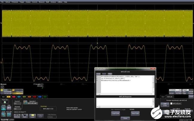 作为一个例子,考虑图5中的示波器测量装置。其中一个100MHz的正弦载波被一个10kHz的方波进行频率调制。波形用一个简单的MATLAB脚本进行解调,解调后的波形显示为数学曲线F1。编辑框允许用户不离开示波器环境就完成脚本的创建、编辑或加载,因此创建或修改脚本非常方便。