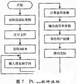 PC端软件使用C语言设计。图形部分使用SDL库。PC机软件用于打开示波器保存的波形文件,还原波形信息,并可以进行光标测量。程序首先初始化SDL视频,然后打开文件读取260个字节,关闭文件。载入背景图案,初始化TTF字体。将波形绘制到背景图案上并计算相关参数输出到相应位置,绘制两个光标,等待用户移动光标。光标移动后重新载入背景和波形并更新相关信息。软件流程如图7所示。