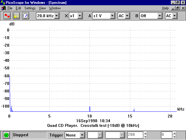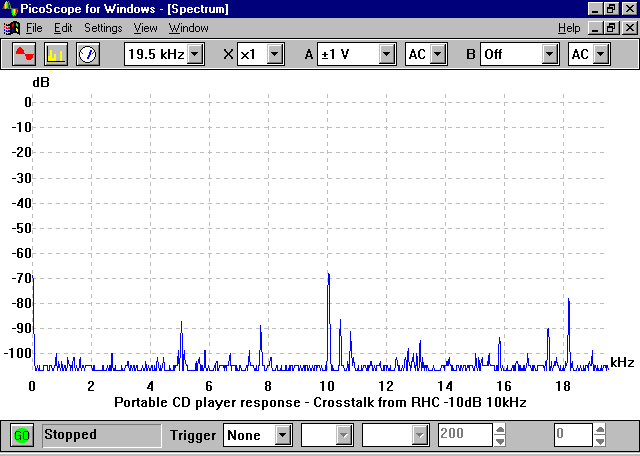 串扰是频谱分析仪能够测试出来的另一个重要指标,我们轮流用每个CD播放器的右声道播放一个10kHz的正弦波(-10dB)。理想情况下,右声道是没有信号的。不过可以看到手持式CD播放器右声道串扰,比左声道信号降低了60dB。