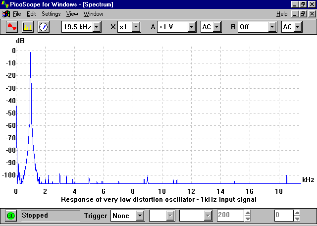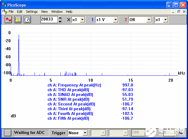 图2跟图1 是相同的试验,但是测试的是Quad CD播放器。跟预期的一样,波形是更干净的。5次谐波是比较明显的,跟主信号相比下降了96dB。图2 中还在PicoScope 中进行了自动化音频测量。现在这些功能已经没有了,新的PicoScope是通过设置菜单中的增加测量按钮来实现的,详见帮助文档。