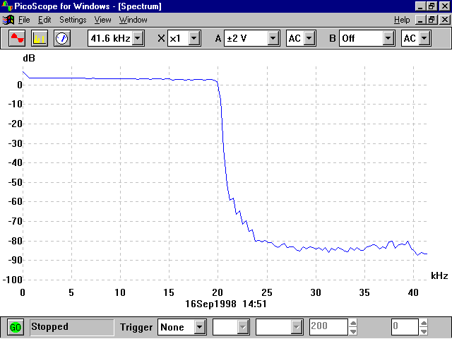 1个理想的CD播放器应该在整个音频域内有一个平滑的频率响应。手持式CD播放器在20Hz~20kHz范围内维持在3dB。用一个正弦波测试,频率扫描从20Hz~20KHz。许多FFT频谱分析仪可能无法绘制这样的一个频谱图,因为快速采集信号,然后却花费几秒中来处理和显示。这样一个扫描周期内,往往只有测试到一个频率峰值。Pico示波器的数据才采集和处理是优化过的,即是在一个相对慢的电脑上(33MHz 386),频谱分析仪也有一个近似实时更新率。测试中我们用的正弦波从20Hz~20kHz扫描完大概用了30s的时间。这段时间内PicoScope完成FFT计算只需要100s,处理速度是大多数频谱分析仪的2~3倍。为了用单线显示频率响应(而不是波形的峰值),我们用Pico示波器的峰值检测函数,如下图5所示。我们可以看到-3dB的点并不是产品参数表中声称的20kHz,只仅仅接近于16kHz。