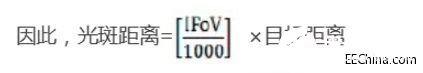 在此公式中,光斑尺寸与目标尺寸的单位以厘米(cm)表示,IFOV以毫弧度(mrad)表示。当距离为100cm,IFOV为1 mrad时,光斑尺寸为0.1 cm。如果0.1 cm的光斑尺寸可在100cm处测得,那么1 cm的光斑尺寸可在1000cm处测得,表示:距离系数比为1:1000。