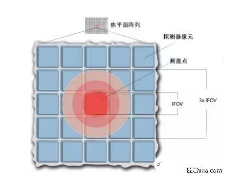 MFOV通常由许多IFOV表示(单个像素点的视场角)。红外探测器热像仪的常用惯例是:考虑到光学反常现象,目标至少需覆盖3倍IFOV的区域。这表示:在一幅热图像中,目标不仅要覆盖一个像素点,而且还应覆盖其周围的像素点,在理想条件下,像素点应该足以完成测量需求。