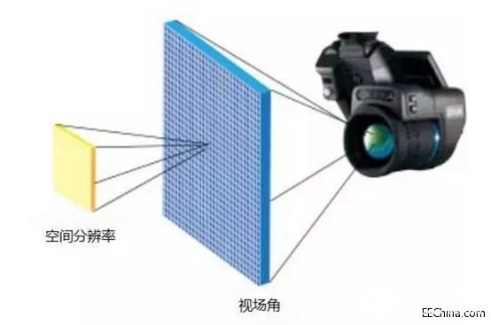 红外热像仪与点温仪相似,其红外辐射被投射至探测器矩阵上,图像上的每个像素点对应一个温值。热像仪生产商在描述其产品空间分辨率时,通常不会明确指出SSR值,而是使用空间分辨率(IFOV)。IFOV是指热像仪探测器阵列单个像元的视场角。