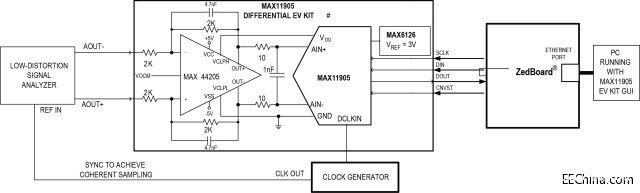 Audio Precision 2722用于产生全差分10kHz正弦波信号,施加到增益为1V/V 的MAX44205驱动器。MAX11905 ADC工作在全差分模式,VREF= 3V,由MAX6126电压基准提供。信号分析仪和ADC同步至相同的时钟发生器,以实现相干采样测量。