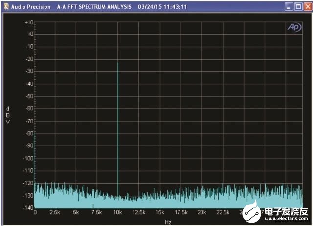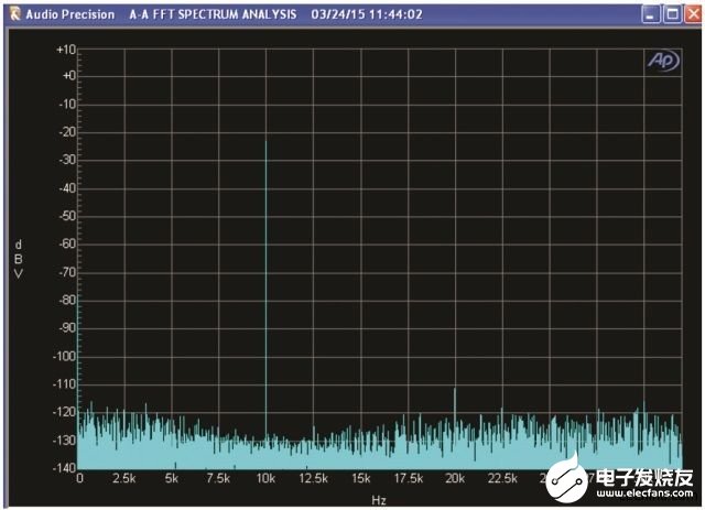 图5所示为陷波滤波器之后的正弦波频谱,无数字预失真。10kHz处的基波为-23dBV;2次谐波为-112dBV,3次谐波为-117dBV。