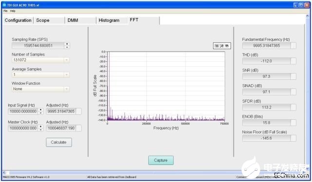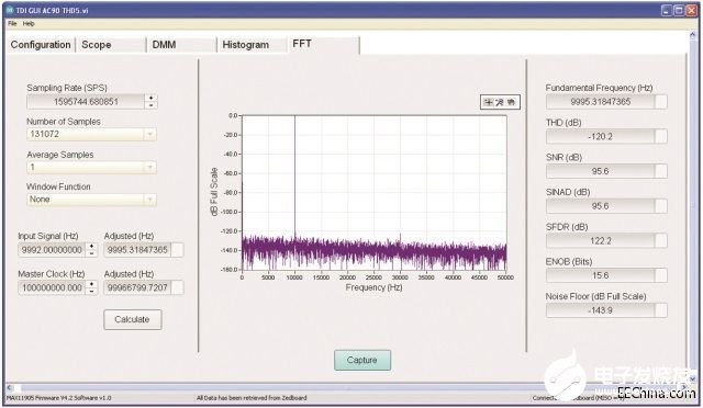 图2:在MAX11905DIFFEVKIT上、采样率为1.6MSPS时测得的DAS系统的原始FFT和动态性能。