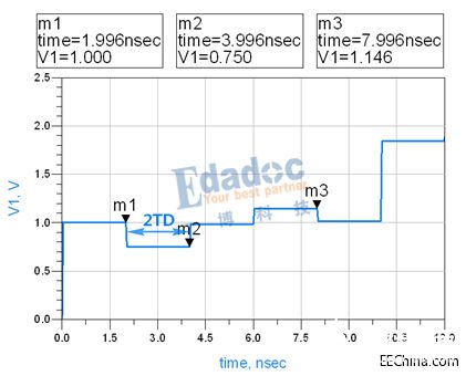 TDR产生一个阶跃信号到待测器件中,会产生入射波,入射波经过时延TD之后在待测器件中遇到阻抗不连续的地方,又会产生发射波,反射波将会叠加在入射波上,再经过时延TD到达TDR的输出端。