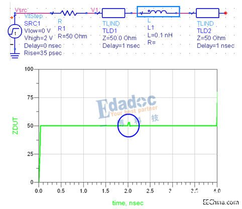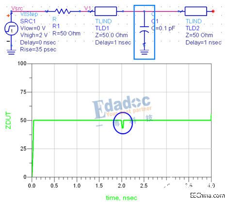 在图(4)中可以看到,当负载呈容性不连续时,阻抗会偏低;当负载呈感性不连续时,阻抗会偏高。PCB中常见的阻抗不连续的地方, 过孔、焊盘、拐角通常呈容性,跨分割处、breakout等通常呈感性。