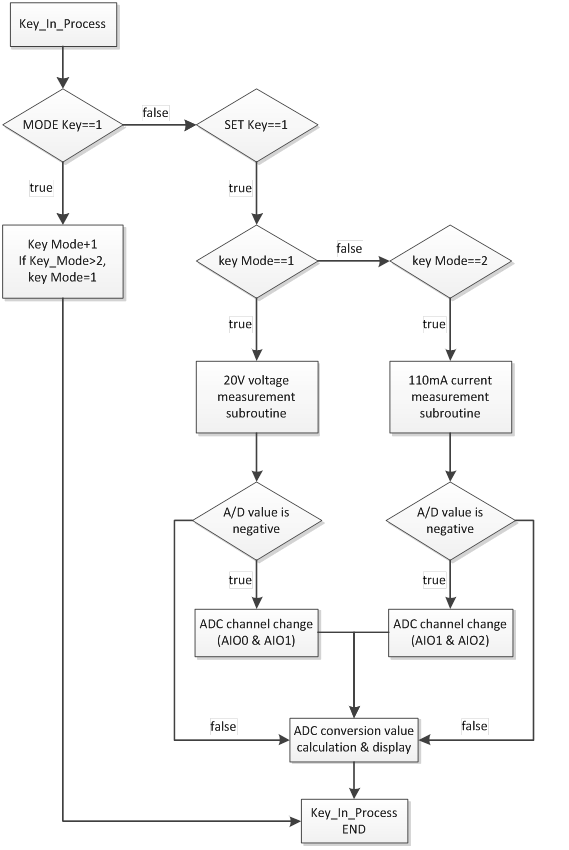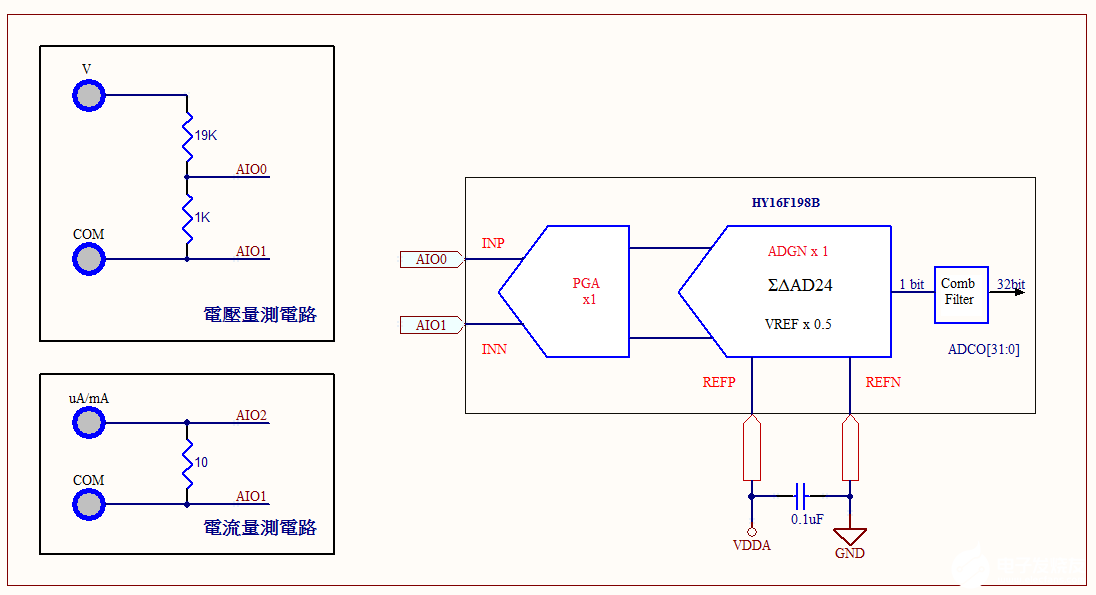 内外解析度之比越小,电压电流表精度越高,但内外解析度之比是有限制的。比如满量程压差为1.1V,要做到2000 Count,内外比为1:10的电压电流表,如果不经过信号放大,那最小要处理的信号为1.1V/(2000×10)=55uV。而HY16F198B的ADC所能处理的最小信号值大约为65nV,所以要完成此规格的量测示相当容易且精准的。