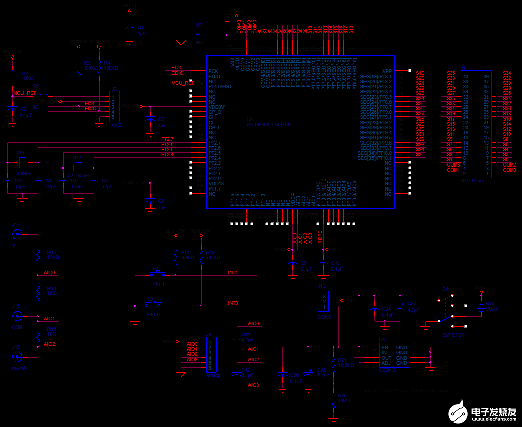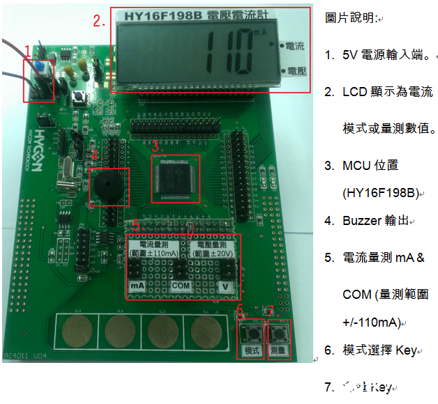 使用HY16F198B内建ADC搭配外部电路进行电压及电流量测,整体电路包含两按钮,分别是(模式选择)、(测量)按钮部分,搭配内部硬体LCD Driver显示量测数值。