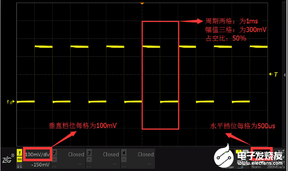 示波器的波形网格是一个很有用的参考,配合屏幕下方的时基和垂直档位,马上可以知道波形的具体参数。如下面这个波形,在开光标和测量项之前,老司机大眼一看,已见分晓。