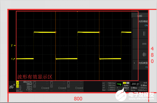 以ZDS2024Plus为例,屏幕的分辨率为800*480,考虑到底部的状态栏和侧边的UI菜单栏,实际的波形界面还小于800*480,但是光标的是由屏幕分辨率决定的,因此光标本身的步进会相对粗糙;