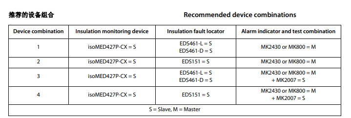 对于报警和状态显示,建议使用特殊的报警显示和测试单元。对于绝缘故障定位,推荐使用EDS系列设备。推荐使用列表上的设备组合。