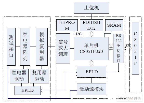 测试仪的单片机选用 Cygnal 公司的模拟和数字混合信号的单片机C8051F020[1],这颗芯 片具有高速51 处理器内核,高达25MIPS 运行速度;64K 字节片上Flash,4K 字节片上RAM(外 部RAM 可扩展至64K 字节)。两个URAT 接口,一个SPI 接口和一个I2C 接口,一个采样速度 为100KSPS,增益可编程的12 Bit ADC 单元(8 路AD 接口)和两个12 Bit 的 DAC 单元。 在本设计中,利用单片机内部12 Bit 的 A/D 转换电路测量电缆接点的电压,12 Bit 的 DAC 电路控制测试激励源的输出电压和电流。I2C 总线连接的8K 字节EEPROM,主要用来 保存所有继电器的使用次数,防止继电器出现寿命过载。外部扩展的16KB 的SRAM,用于暂 存测试数据。单片机外部扩展的EPLD,用于地址译码,扩展测试控制空间,包括和级联机 箱的通信空间,测量接口板的继电器、模拟复用器控制空间等。