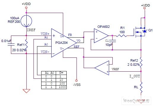 图中恒流源跟随器选用TI 公司的具有极低偏置电流(1pA)的精密运算放大器OPA602。 它的正输入端和负输入端相当于“虚断”,电压等于PGA204 输出的电压G(VIN+-VIN-)+VREF ( PGA204 的电压参考输入)。则流经精密电阻Ref2 两端的电流为: