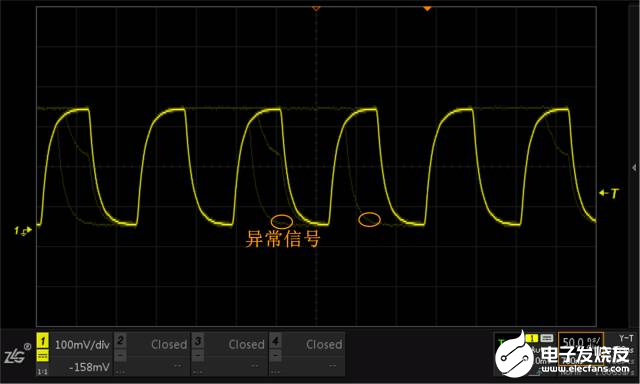 死区时间的大小影响着遗漏信号的多少,也决定了捕获异常信号概率的大小,那么如何去计算示波器死区时间的大小呢?本次以ZDS2024 Plus示波器为例,ZDS2024 Plus的波形刷新率为330Kwfm/s,将时基档位调制50ns/div,可以看到异常信号闪现在示波器的屏幕上,如图3所示。
